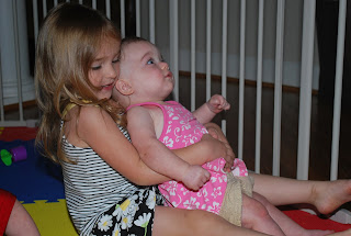 I didn't quite expect what happened next. I know that the babies stay in their playroom a lot, but I never thought about how the gates into the playroom isn't really obvious. Sydney ran up to the playroom "fence," pinched off a little piece of cheese, and then proceeded to feed the babies -- just like animals at a petting zoo. . . .